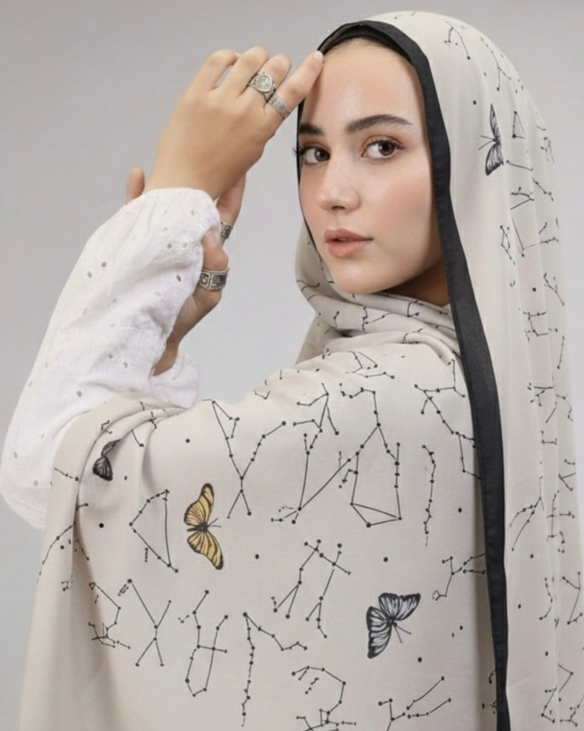 The celestial voile hijab is designed for women who appreciate subtle detail and timeless modest style. Inspired by the calm beauty of the night sky, this hijab features delicate constellation line drawings combined with soft butterfly motifs. The result is a refined print that feels elegant without being overpowering.